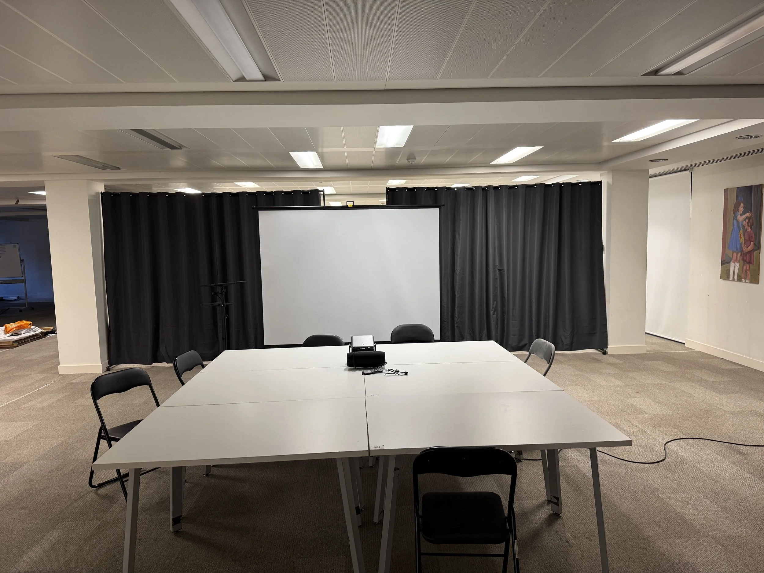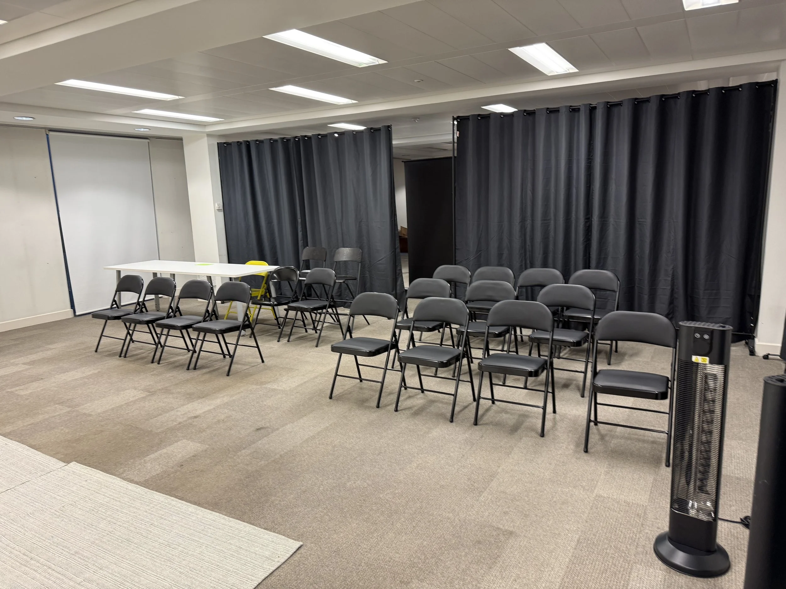 We offer a 25 seat theatre space with basic lighting and speakers. We have black backdrop curtains and use of a projector too.